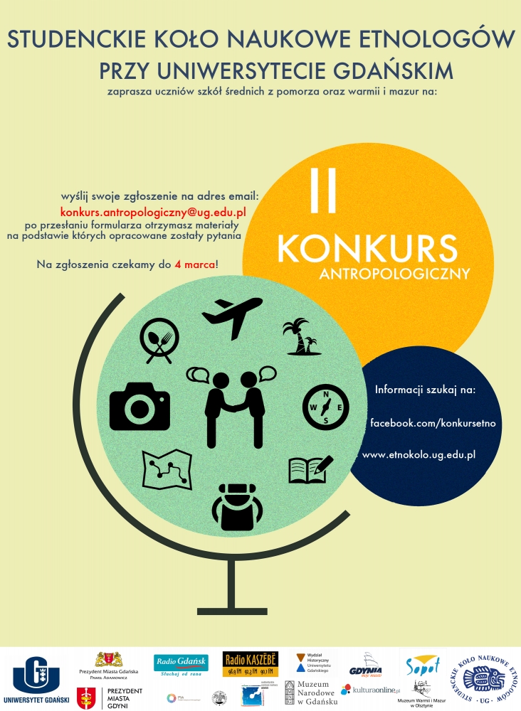 cccStudenckie Koło naukowe Etnologów i Uniwersytet Gdański zapraszają uczniów pomorskich i warmińsko-mazurskich szkół ponadgimnazjalnych do udziału w II Konkursie Antropologicznym.