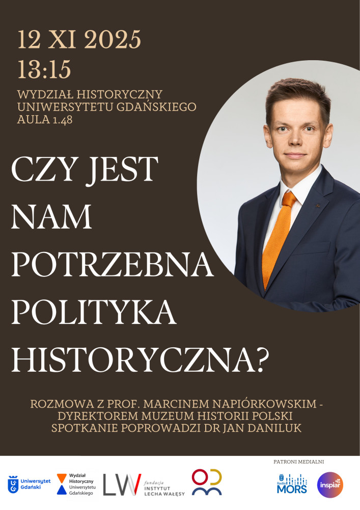 W środę, 12 listopada 2025 zapraszamy na spotkanie pt. „Czy jest nam potrzebna polityka historyczna? Rozmowa z prof. Marcinem Napiórkowskim, dyrektorem Muzeum Historii Polski”. Spotkanie odbędzie się o godz. 13.15 w auli 1.48 na Wydziale Historycznym UG.