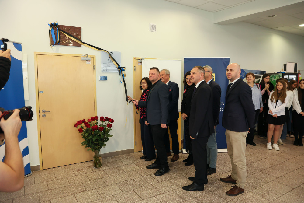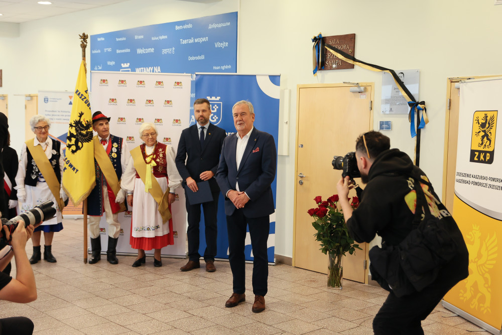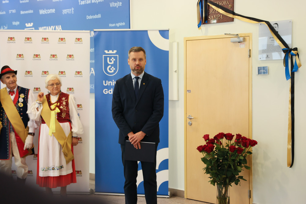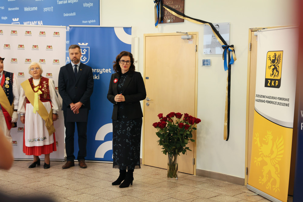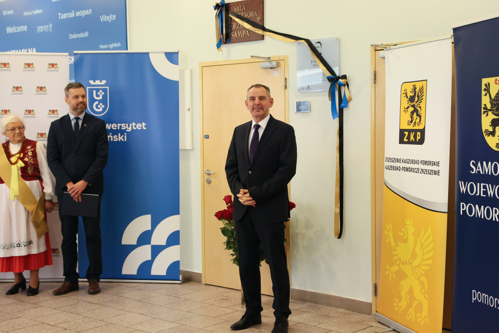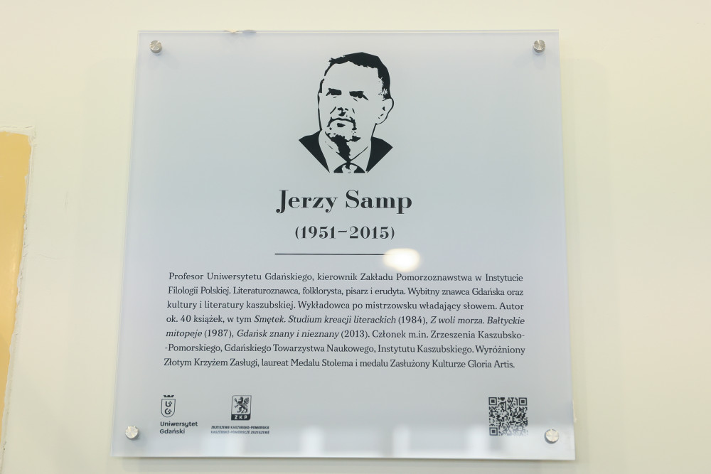 Uroczyste nadanie imienia Profesora Jerzego Sampa jednej z auli w budynku Wydziału Filologicznego i Wydziału Historycznego Uniwersytetu Gdańskiego przy ul. Wita Stwosza 55 odbyło się w piątek, 7 listopada 2025 r. To wydarzenie stanowi ważny krok w pielęgnowaniu akademickiej tradycji i tożsamości uczelni, a jednocześnie jest wyrazem uznania dla dorobku naukowego Profesora oraz jego wkładu w rozwój badań nad Pomorzem, Kaszubami i Gdańskiem. Wydarzeniu towarzyszyło odsłonięcie przez żonę Profesora Barbarę Samp i syna Christiana Sampa pamiątkowej tablicy, która będzie trwałym symbolem jego obecności w życiu Uniwersytetu.