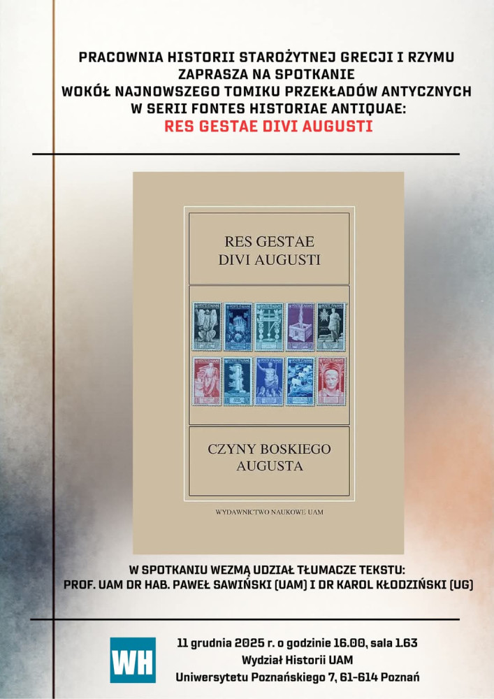 W najbliższy czwartek, 11 grudnia 2025 r., dr Karol Kłodziński z Zakładu Historii Starożytnej UG, na zaproszenie Pracowni Historii Starożytnej Grecji i Rzymu UAM w Poznaniu (szczegóły na plakacie), weźmie udział w promocji autorskiej poświęconej najnowszej edycji naukowej wraz z obszernym komentarzem historycznym "Res Gestae Divi Augusti", najważniejszego źródła epigraficznego do dziejów wczesnego Cesarstwa Rzymskiego.