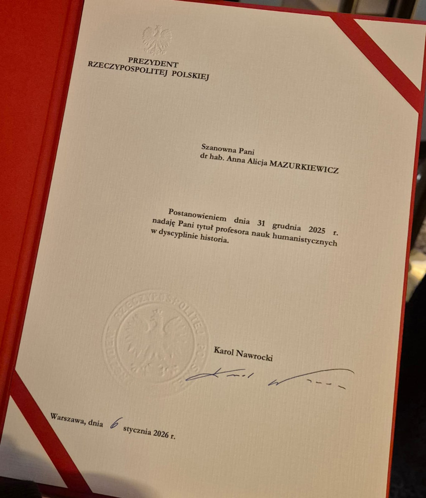 Z dumą informujemy, że 7 stycznia 2026 r. Prezydent Rzeczypospolitej Polskiej, Karol Nawrocki, podczas uroczystości w Pałacu Prezydenckim w Warszawie wręczył nominację profesorską dr hab. Annie Mazurkiewicz, nadając jej tytuł profesora nauk humanistycznych w dyscyplinie historia.